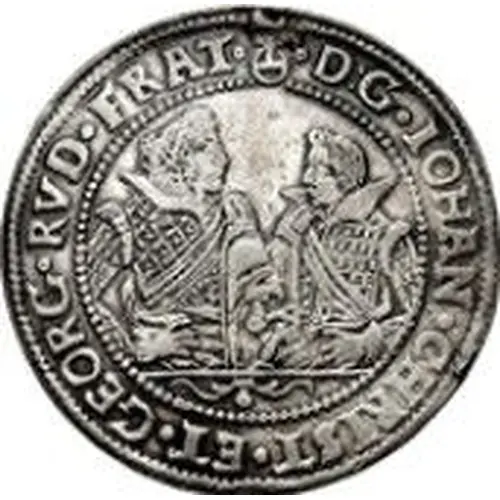 1/2-length figures of Johann Christian & Georg Rudolph facing each other, right figure smaller than left, arabesques under busts, legend around a beaded inner circle, imperial orb at top. |
