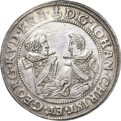 1/2-length figures of Johann Christian & Georg Rudolph facing each other, right figure smaller than left, horizontal line under busts without arabesques, legend around a beaded inner circle, imperial orb at top. |
