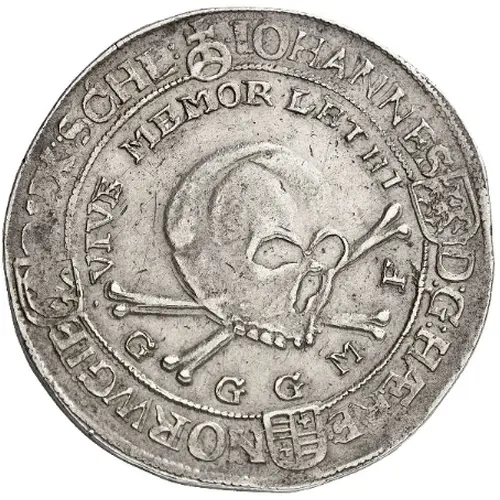 | Obverse description | Skull, imperial orb at top seperating legend, 3 shielded arms in legend. |
