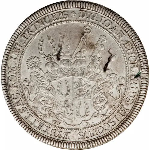 | Obverse description | Coat of arms helmeted and supported by two lions, legend around. |