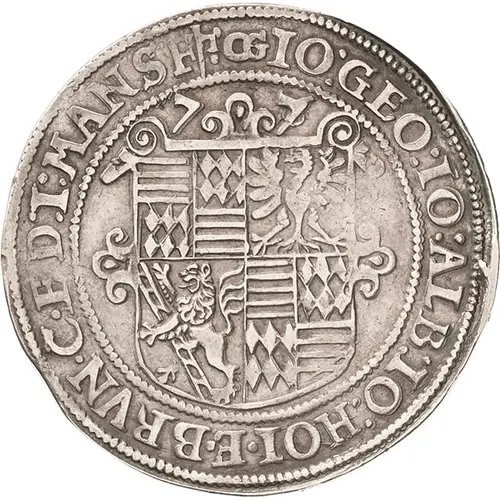 | Obverse description | Ornate shield of new Mansfeld arms, date above, legend begins with small imperial orb. |