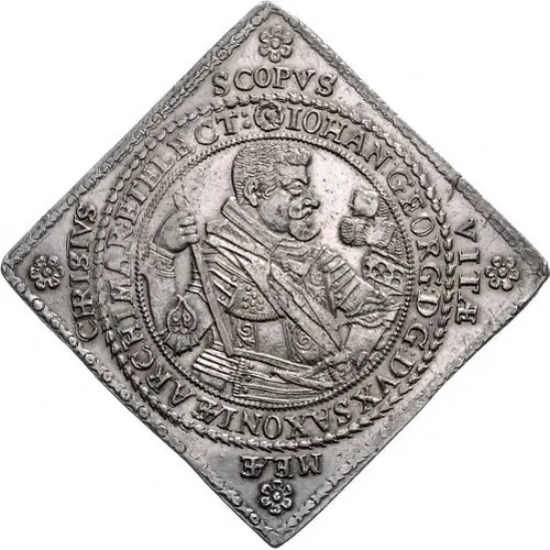 | Obverse description | Armored half-length figure of Elector John George I of Saxony facing right, holding ceremonial marshal baton in right hand and helmet in left hand. Flowers in corners. |
