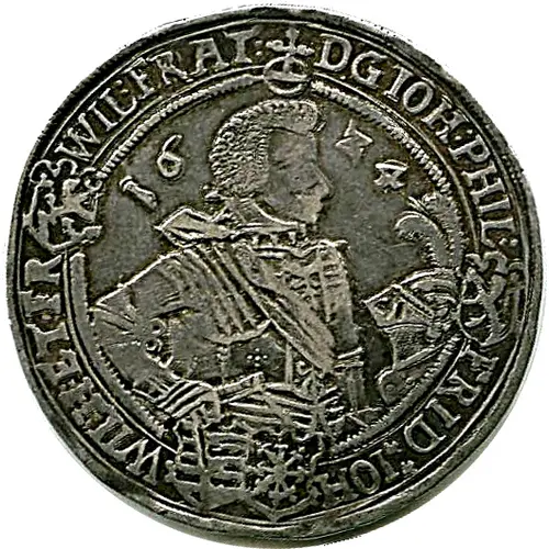 | Obverse description | Half-length figure of Johann Philip I turned right above arms. Date is seperated to the sides. Legend surrounding with arms to the left and right. |