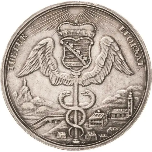 | Obverse description | Winged cadeuceus surmounted with crowned arms of Saxony, view of Jena in background, rays streaming from sun above, legend at sides |