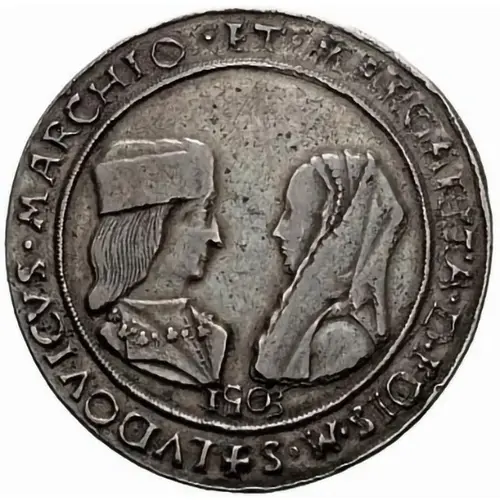 | Obverse description | Facing busts of Ludovico, wearing a hat and the collar of the Order of St. Michael, and Margarita wearing a veil. |