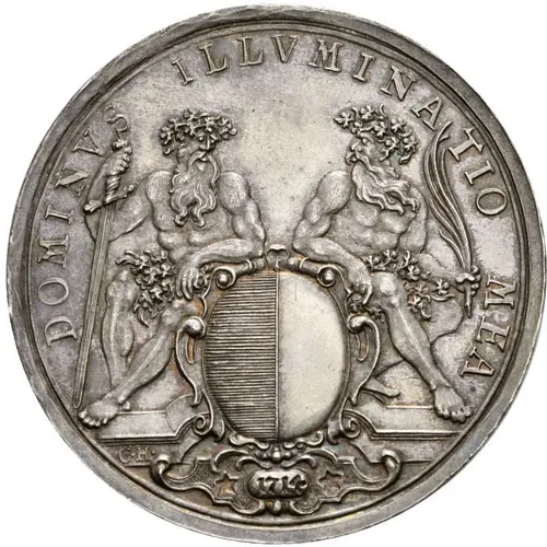 | Obverse lettering | DOMINVS ILLVMINATIO MEA 1714 C • H • (Translation: The Lord is my light.) |