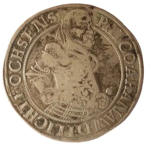 | Reverse description | Ornate 4-fold arms of Hanau and Lichtenberg with central shield of Ochsenstein, 2 helmets above, date at end of legend. |