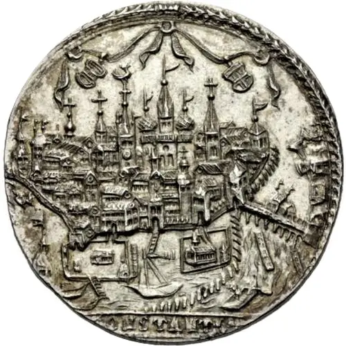 | Reverse description | 4 crowned baroque styled arms seperating the date, 20 oval arms surrounding. |