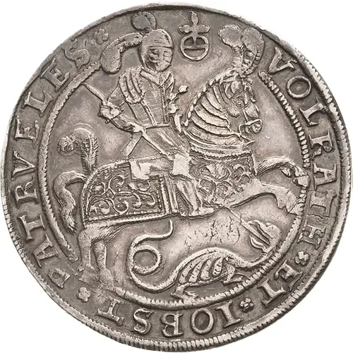 | Beschrijving voorzijde | Saint George slaying the dragon right, orb at upper right. |