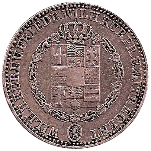 | Reverse lettering | KURFÜRSTENTHUM HESSEN EIN THALER XIV EINE FEINE MARK |