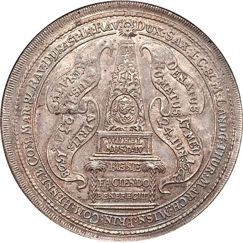| Obverse lettering | DUX:SAX:I:C:&M:LANDG:THUR:MARCH:MISN:PRIN:COM:HENNEB:COM:MAR:&RAV:DYNAST:IN:RAV. NATUS.11 APRIL: 1598 // RENATUS. 23 AP: 1598 DENATUS. 17.MEY // HUMATUS.24.IUN:1662 WILHEL // MUS.D:IV BENE // FACIENDO // BENEFECIT |
