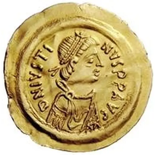 D N IVSTI - NVS PP AVC (Translation: Dominus Noster Justin Perpetuus Augustus Our Lord, Justin, perpetual August) |