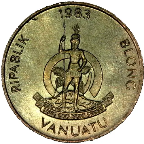 | توضیحات روی سکه | The arms of Vanuatu featuring a Melanesian warrior standing in front of a curved boar`s tooth above a scroll reading `LONG GOD YUMI STANAP` and the date above. |