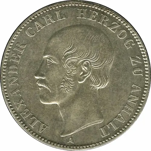 Inscription around rim. Head of Duke Alexander Carl of Anhalt-Bernburg facing left. Mint mark at bottom. |