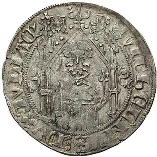 | Beschrijving voorzijde | Duke`s half-length figure seated on a gothic throne, sword leaning on shoulder and holding a short lilly scepter in the other hand. Shielded eagle and lion arms above. |