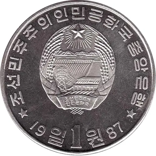 | Opis líce | ⋆조선민주주의인민공화국중앙은행⋆ 19 일 1 원 87 (Translation: Central Bank of the Democratic People`s Republic of Korea One Won) |