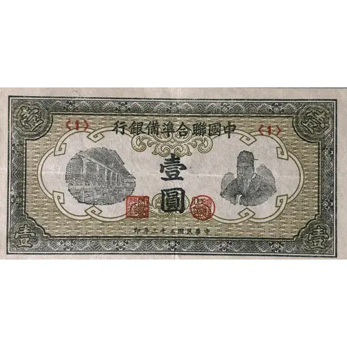 行銀備準合聯國中 壹 圓 印年三十三國民華中 (Translation: Federal Reserve Bank of China 1 Yuan Printed in Republic of China 33th Year) |