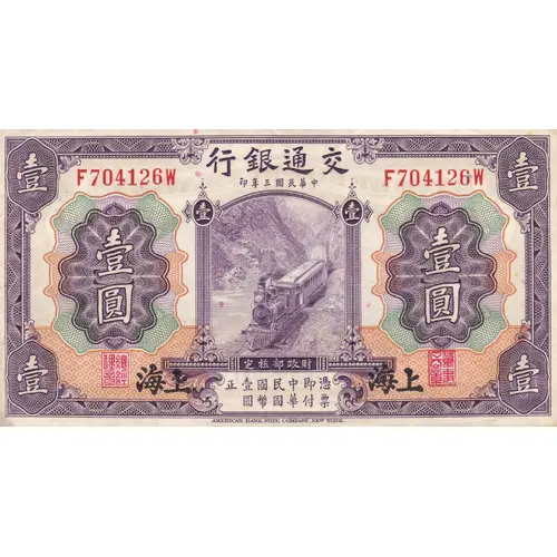 1 1 Bank of Communications Promises to Pay the Bearer on Demand at its Office Here 1 1 One Yuan Of the National Coinage of the Republic of China. October 1st 1914. |
