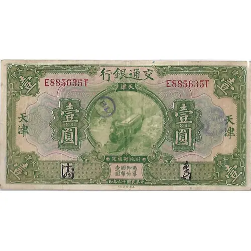 | Obverse lettering | BANK OF COMMUNICATIONS PROMISES TO PAY THE BEARER ON DEMAND AT ITS OFFICE HERE ONE YUAN NATIONAL CURRENCY TIENTSIN November 1st, 1927 AMERICAN BANK NOTE CO NEW YORK |