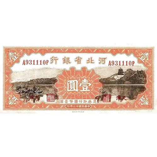 | Obverse lettering | 行銀省北河 圓壹 圓壹幣國付即券憑 印年三廿國民華中 (Translation: Hopeh Province Bank One Yuan To pay by this note one yuan national currency Printed year 23 of the Chinese Republic) |