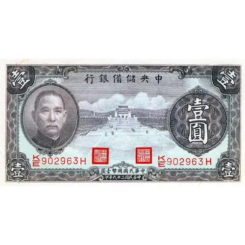 | Obverse lettering | 行銀備儲央中 圓壹 年九十二國民華中 (Translation: Central Reserve Bank of China One Yuan The 29th Year of the Republic) |
