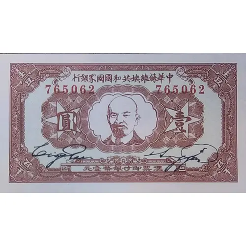 | Obverse lettering | 中華蘇維埃共和國國家銀行西北分行 壹圓 凭票即付银币一元 (Translation: CHINESE SOVIET REPUBLIC NATIONAL BANK - NORTHWEST BRANCH One Yuan Use to exchange for 1 silver dollar) |