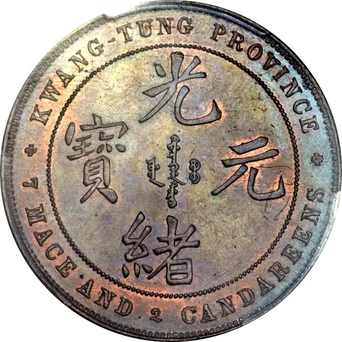 | Obverse lettering | KWANG-TUNG PROVINCE 光 ᠪᠠᡩᠠᡵᠠᠩᡤᠠ 寶 ᠶᡠᠸᠠᠨ ᠪᠣᠣ 元 ᡩᠣᡵᠣ 緒 7 MACE AND 2 CANDAREENS (Translation: Guangxu (Emperor) / Yuanbao (Original currency) Guangxu (Emperor) / Yuanbao (Original currency)) |