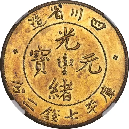 造省川四 光 ᠪᠠᡩᠠᡵᠠᠩᡤᠠ 寶 ᠶᡠᠸᠠᠨ ᠪᠣᠣ 元 ᡩᠣᡵᠣ 緒 分二錢七平库 (Translation: Made in Szechuan Province Guangxu (Emperor) / Yuanbao (Original currency) Guangxu (Emperor) / Yuanbao (Original currency) Worth 7 Mace and 2 Candareens (weight)) |
