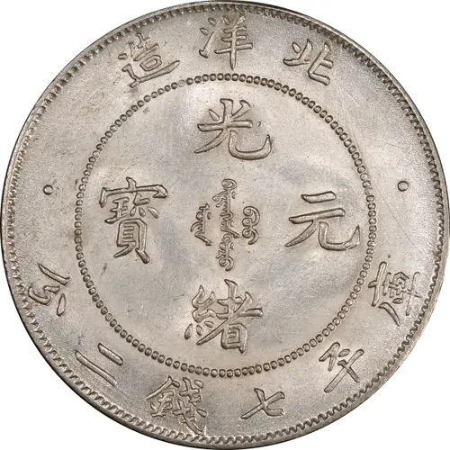 造洋北 光 ᠪᠠᡩᠠᡵᠠᠩᡤᠠ 寶 ᠶᡠᠸᠠᠨ ᠪᠣᠣ 元 ᡩᠣᡵᠣ 緒 分二錢七平库 (Translation: Made at Pei Yang Guangxu (Emperor) / Yuanbao (Original currency) Guangxu (Emperor) / Yuanbao (Original currency) Worth 7 Mace and 2 Candareens (weight)) |