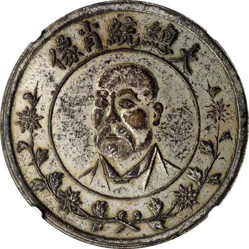 | Obverse description | Bearded bust of Yuan Shikai partially facing left with floral below and Chinese ideograms above. |