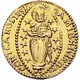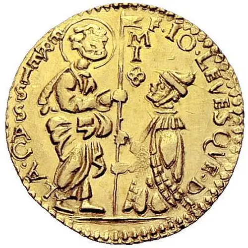 St. John standing to right, presenting the banner of the Order to the grand master kneeling to left. |