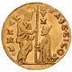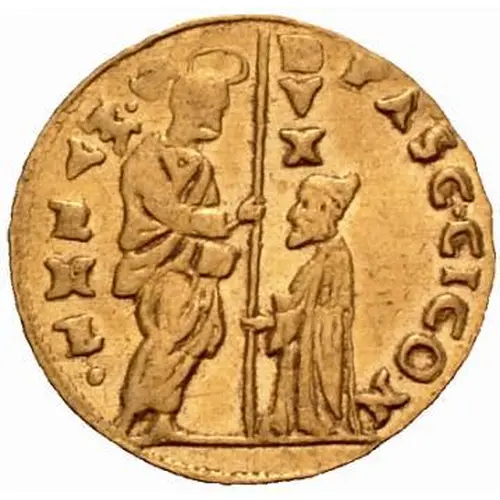 | Beschrijving voorzijde | St. Mark standing at left presenting staff with DVX vertically at top to doge kneeling at right. |