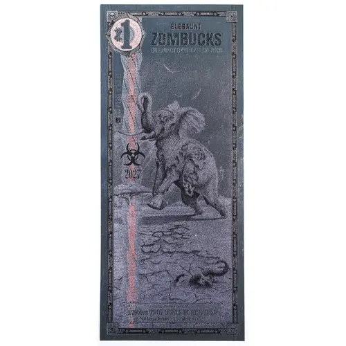 | Obverse lettering | Z1 ELEGAUNT ZOMBUCKS CURRENCY OF THE APOCALYPSE THIS ZOMBUCKS CONTAINS 1/1000TH TROY OUNCE PURE SILVER NOT LEGAL TENDER · US PATENT 10781520 2026 AURUM 10,000 of 10,000 |