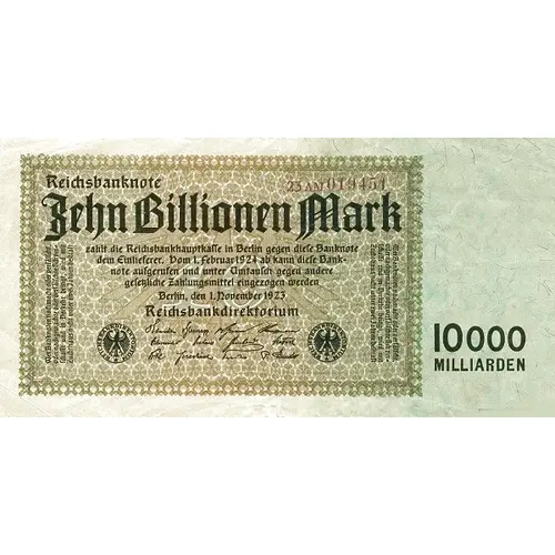 Reichsbanknote Zehn Billionen Mark zahlt die Reichsbankhauptkaſſe in Berlin gegen dieſe Banknote dem Einlieferer. Vom 1. februar 1924 ab kann dieſe Bank- note aufgerufen und unter Umtauſch gegen andere geſeꜩliche Zahlungsmittel eingezogen werden Berlin, den 1. November 1923 Reichsbankdirektorium 5 REICHSBANKDIREKTORIUM REICHSBANKDIREKTORIUM Wer Banknoten nachmacht oder verfälſcht, oder nachgemachte oder verfälſchte ſich ver= ſchafft und in Verkehr bringt, wird mit Zuchthaus nicht unter zwei Jahren beſtraft. Wer Banknoten nachmacht oder verfälſcht, oder nachgemachte oder verfälſchte ſich ver= ſchafft und in Verkehr bringt, wird mit Zuchthaus nicht unter zwei Jahren beſtraft. 10000 MILLIARDEN |
