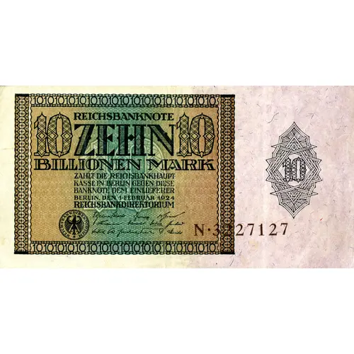 REICHSBANKNOTE 10 10 ZEHN BILLIONEN MARK ZAHLT DIE REICHSBANKHAUPT- KASSE IN BERLIN GEGEN DIESE BANKNOTE DEM EINLIEFERER BERLIN, DEN 4. FEBRUAR 1924 REICHSBANKDIREKTORIUM REICHSBANKDIREKTORIUM 10 |