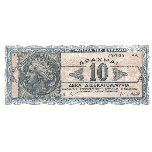 | Obverse lettering | ΤΡΑΠΕΖΑ ΤΗΣ ΕΛΛΑΔΟΣ ΔΡΑΧΜΑΙ ΔΕΚΑ ΔΙΣΕΚΑΤΟΜΜΥΡΙΑ Ο ΔΙΟΙΚΗΤΗΣ ΠΛΗΡΩΤΕΑΙ ΕΠΙ ΤΗ ΕΜΦΑΝΙΣΕΙ ΟΙ ΔΙΕΥΘΥΝΤΑΙ ΕΝ ΑΘΗΝΑΙΣ ΤΗ 20η ΟΚΤΩΒΡΙΟΥ 1944 (Translation: Bank of Greece, Drachmai Ten Billion, in Athens on 20th October 1944) |