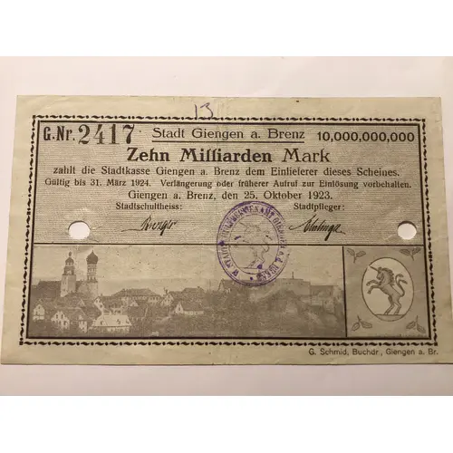 Legenda do anverso Stadt Giengen a.Brenz. 10,000,000,000 ZEHN MILLIARDEN MARK zahlt die Stadtkasse Giengen a.Brenz dem Einlieferer dieses Scheines. Gültig Gabis 31.Marz 1924.Verlängerung oder früherer Aufruf zur Einlösung vorbehalten Giengen a.Brenz,den 25.Oktober 1923. Stadt Schultheiß. Stadtpfleger: