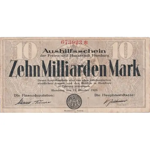 | Obverse lettering | 10 10 673923 Aushilfschein der Freien und Hansestadt Hamburg Zehn Milliarden Mark Dieser aushilfsschein wird von allen hamburgischen staatlichen Kassen und den Banken in Hamburg in Zahlung genommen. Hamburg, den 15. Oktober 1923. Die finanzdeputation. Die haupstaatskasse. FINANZDEPUTATION HAMBURG Broschek & Co. Hamburg |
