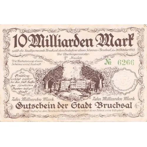 | Legenda del dritto | Zehn Milliarden Mark zahlt die Stadtgemeinde Bruchsal dem Einlieferer dieses Scheins. Bruchsal, den 24.Oktober 1923. Der Oberbürgermeister |