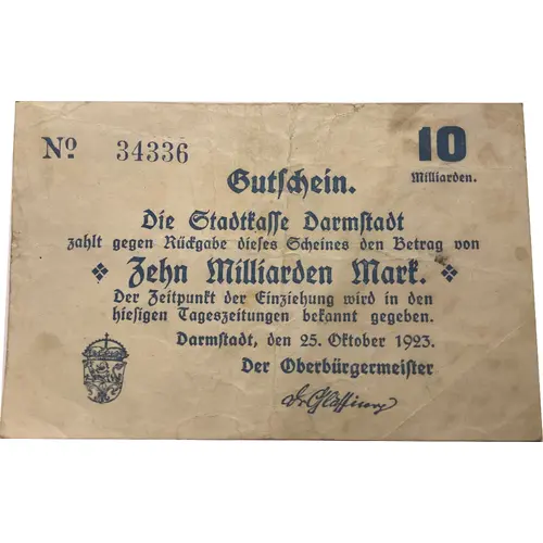 | Obverse lettering | 10 Milliarden Gutschein Die Stadtkasse Darmstadt Zahlt gegen Rückgabe dieses Scheines den Betrag von Zehn Milliarden Mark Der Zeitpunkt der Einziehung wird in den hiesigen Tageszeitungen bekannt gegeben Darmstadt,den 25.Oktober 1923 Der Oberbürgermeister |