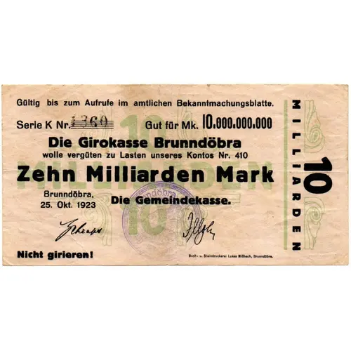 | Obverse lettering | Gültig bis zum Aufrufe im amtlichen Bekanntmachungsblatte Serie K Nr. (SN) Gut für Mk. 10.000.000.000 Die Girokasse Brunndöbra wolle vergüten zu Lasten unseres Kontos Nr. 410 Zehn Milliarden Mark Brunndöbra, 25.Okt 1923 Die Gemeindekasse Nicht girieren! |