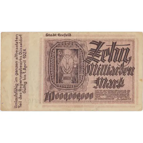 Stadt Crefeld Zehn Milliarden Mark ZAHLT DIE STADT CREFELD DEM VORZEIGER. DER ZEITPUNKT DER EINLÖSUNG WIRD DURCH DIE CREFELDER TAGESZEITUNGEN BEKANNT GE- MACHT. CREFELD, 15 OKTOBER 1923. DER OBERBÜRGERMEISTER Dr. Johansen 10000.000.000 Umlaufsfähig im ganzen altbezetzten Teil des Regierungsbezirks Düsseldorf. Gültig bis 1. April 1924. |