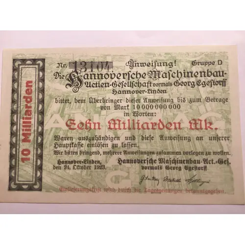 | Obverse lettering | 10 Milliarden Anweisung! Gruppe D Die Hannoversche Maschinenbau Actien-Gesellschaft vormals Georg Egestorff Hannover-Linden (HANOMAG) bittet,dem Überbringer dieser Anweisung bis zum Betrage von Mark 10 000 000 000 in Worten:Zehn Milliarden Mk. Waren auszuhändigen und diese Anweisung an unsere Hauptkasse einlösen zu Lassen Wir bitten bringend,mehrere Anweisungen zusammen vorlegen zu wollen Hannover-Linden. Hannoversche Maschinenbau=Act.=Ges.vormals Georg Egestorff Einlieferungstrift wird durch die Tageszeitungen bekanntgegeben |