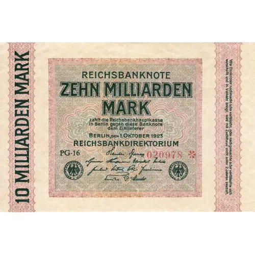 REICHSBANKNOTE ZEHN MILLIARDEN MARK zahlt dieReichsbankhauptkasse in Berlin gegen diese Banknote dem Einlieferer BERLIN, DEN 1. OKTOBER 1923 REICHSBANKDIREKTORIUM |