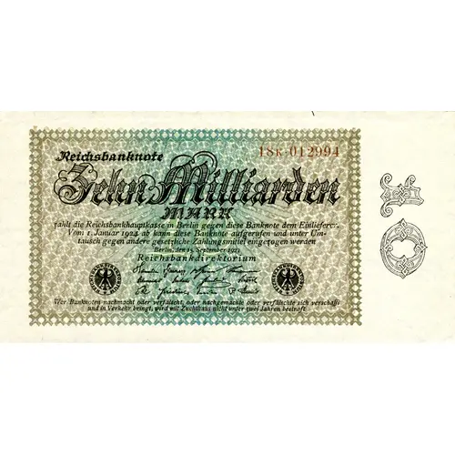 | Obverse lettering | Reichsbanknote Zehn Milliarden MARK 15 September 1923 10 |