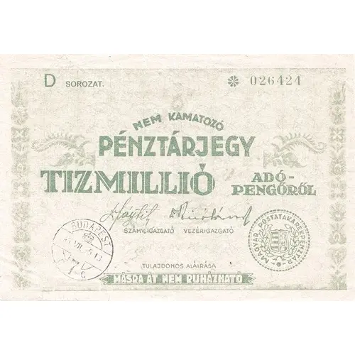 | Obverse lettering | NEM KAMATOZÓ PÉNZTÁRJEGY TÍZMILLIÓ ADÓPENGŐRŐL (Translation: Interestless cash ticket for ten million tax Pengő) |