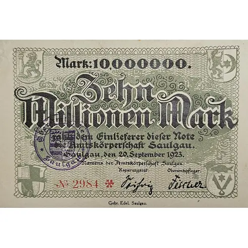 | Obverse lettering | Zehn Millionen Mark zahlt dem Einlieferer dieser Note die Amtskörperschaft Saulgau Saulgau, den 20. September 1923 |