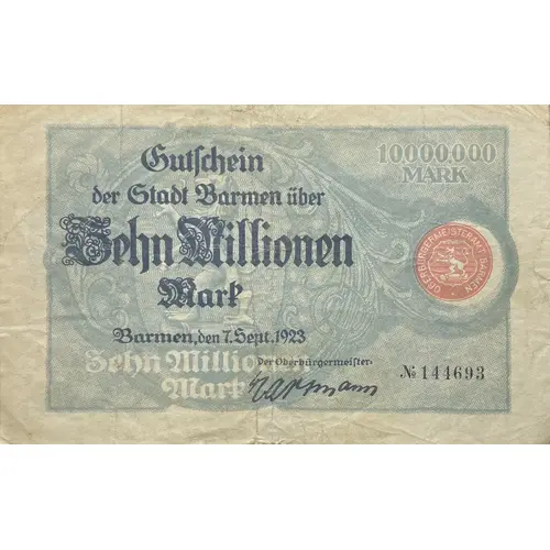 | Ön yüz lejandı | Gutschein Der Stadt Barmen über Zehn Millionen Mark Barmen, Den 7. Sept. 1923 Zehn Millionen Mark Der Oberbürgermeister: 10,000,000 MARK OBERBÜRGERMEISTERAMT BARMEN |