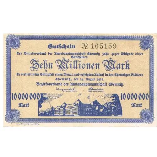 Obverse lettering Gutschein no Der Bezirksverband der Amtshauptmannschaft Chemnitz zahlt gegen Rückgabe dieses Gutscheines Zehn Millionen Mark Er verliert seine Gültigkeit nach erfolgtem Aufruf in den Chemnitzer Blättern Chemnitz, den 24. August 1923. Bezirksverband der Amtshauptmannschaft Chemnitz.