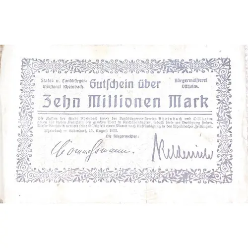 Stadt= u. Landbürgermeisterei Reinbach. Bürgermeisterei Ollheim Gutschein über zehn millionen Mark 一一一一一一一一一一一一一一一一一一一一一一一一一一一一一一一一一一 die kassen der stadt Rheinbach sowie der Land Bürgermeistereien Rheinbach und Ollheim geben für diesen gutschein den gleichen bzert in Reichsbanknoten, sobald biese zur Bersügung ftehen. Dieser Gutschein verliert seine Gultigfeit einen monat Aufkündigung in den Rheinbacher Zeitungen. Rheinbach 一 Ludendorf, 15. August 1923. Die Bürgermeister: (Translation: City and Land mayor`s office in Reinbach. Mayor`s office in Ollheim. Voucher for ten million marks 一一一一一一一一一一一一一一一一一一一一一一一一一一一一一一一一一一 The cash registers of the city of Rheinbach and the state mayors of Rheinbach and Ollheim give the same voucher in Reichsbanknotes for this voucher as soon as there is a payment. This voucher loses its validity one month notice in the Rheinbach newspapers. Rheinbach 一 Ludendorf, 15. August 1923. The mayors:) |